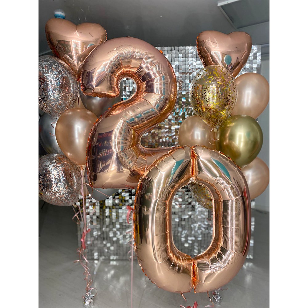 Стильная композиция в роскошных золотых и перламутровых оттенках — идеальный выбор для празднования 20-летия! Фольгированные цифры, сердца и шарики с конфетти создают эффект вау и превращают любое пространство в настоящую фотозону мечты. Такой декор придаст празднику элегантности, блеска и незабываемых эмоций.
