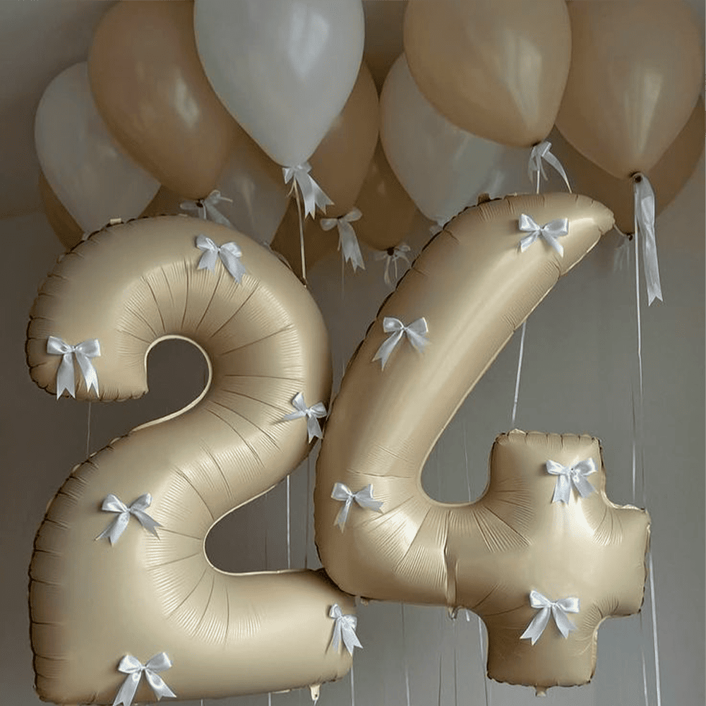 Изысканный декор из золотистых воздушных шариков, украшенных нежными белыми бантиками, создает атмосферу очарования и праздника. Нежные шарики на заднем плане дополняют композицию, добавляя легкости и романтичности, превращая обычное мгновение в полный сияния праздник.