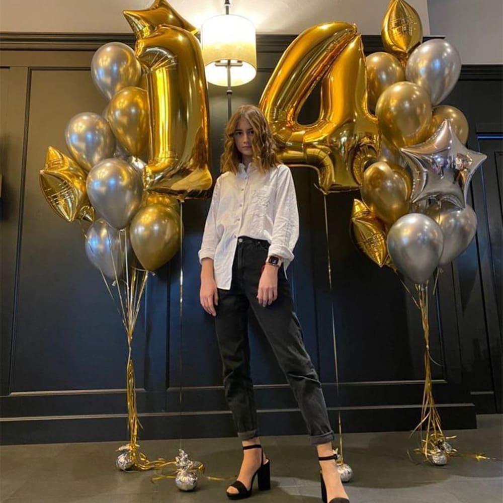 Отпразднуйте стильную юность с этой элегантной композицией в золотых оттенках. Большие цифры вместе со сверкающими шариками создают атмосферу праздника и восторга, делая день незабываемым для виновника торжества и гостей.