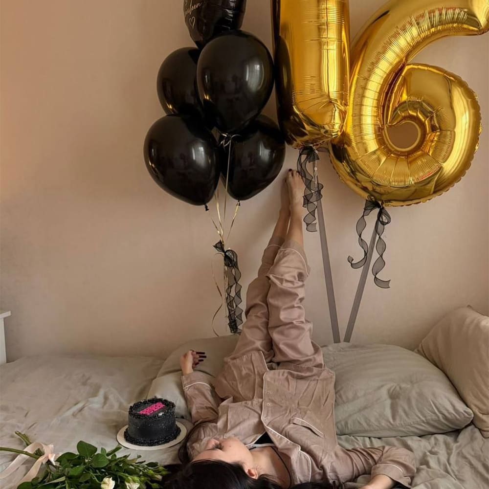 Отметьте волшебные 16 с особым шармом! Современная композиция в черных и золотых оттенках с шариками в форме цифр создает стильную и веселую атмосферу. Идеально для празднования юности и новых достижений!