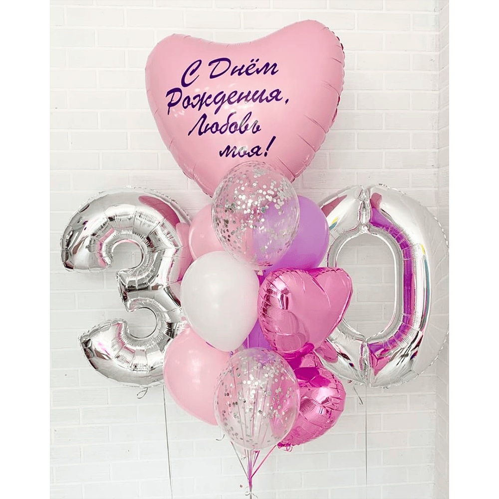 Отметьте особый день с нежной палитрой в розовых и серебряных тонах, полных любви и радости. Сердце с поздравлением передает душевное тепло, а сияние шариков символизирует праздник и вдохновение. Пусть этот юбилей будет наполнен светом, счастьем и незабываемыми моментами любви.