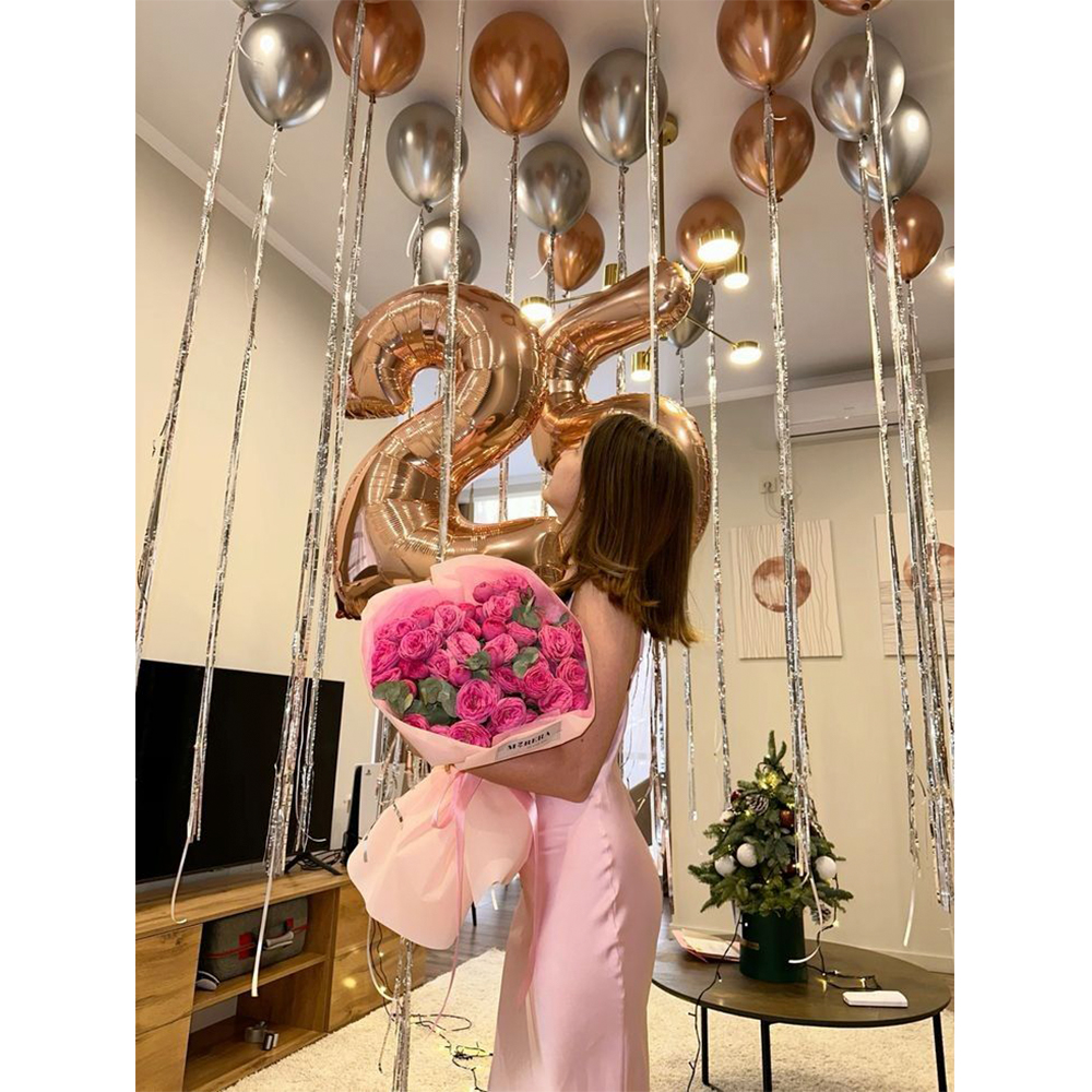 Отметьте 25-летие в атмосфере роскоши и красоты. Розовые и золотистые шары создают настоящий праздник, а букет ярких роз добавляет нежности и очарования. Идеальный декор для тех, кто ценит утонченность и элегантность. Пусть ваш юбилей будет наполнен радостью и незабываемыми моментами!