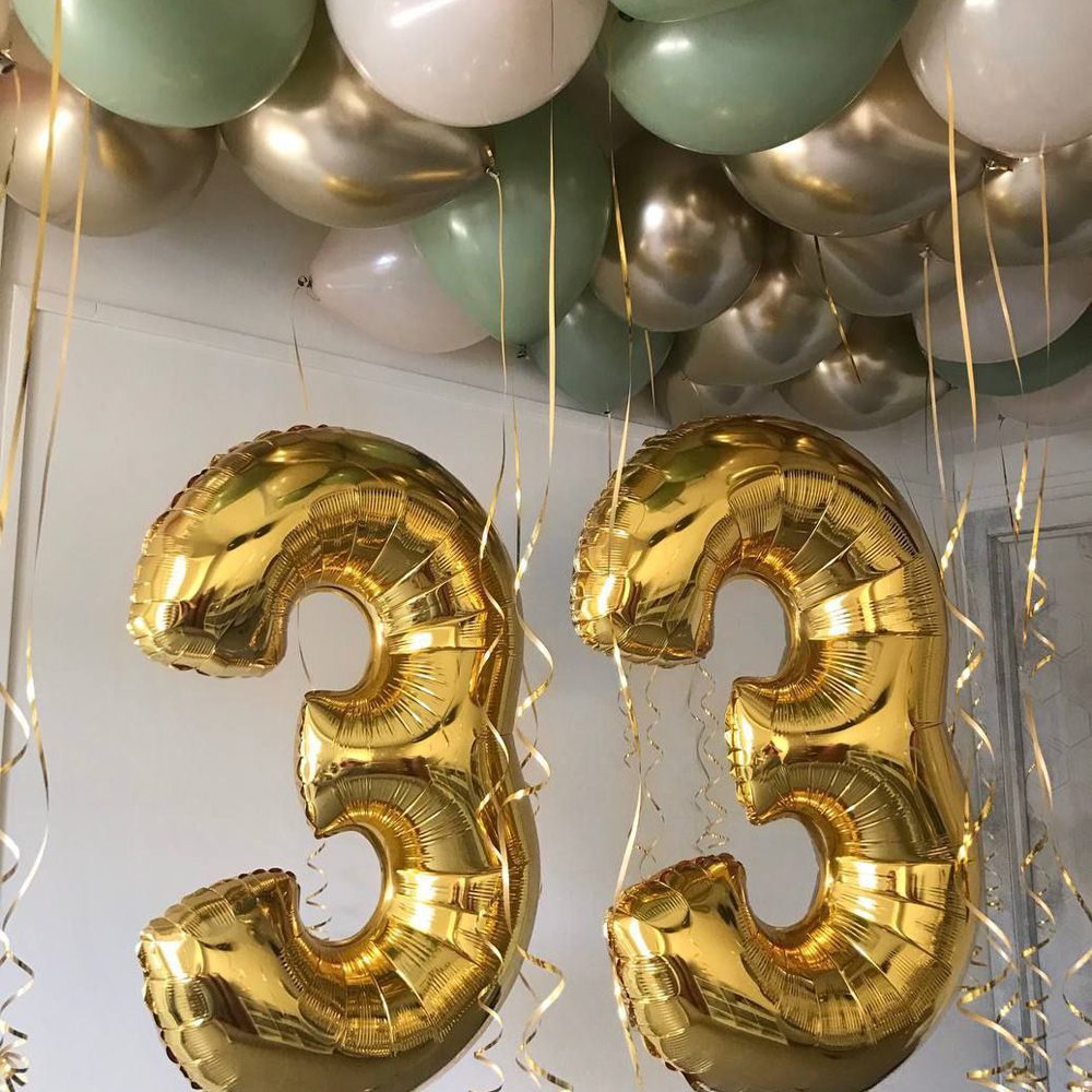 Торжественная композиция из шариков символизирует новый этап жизни. Золотистые цифры «33» окружены нежными оттенками оливкового, кремового и золотого цветов, которые гармонично переплетаются. Ленты добавляют легкости и движения, подчеркивая важность праздничного события. Это фото передает атмосферу светлой радости и новых начинаний, которые открываются с каждым новым годом.