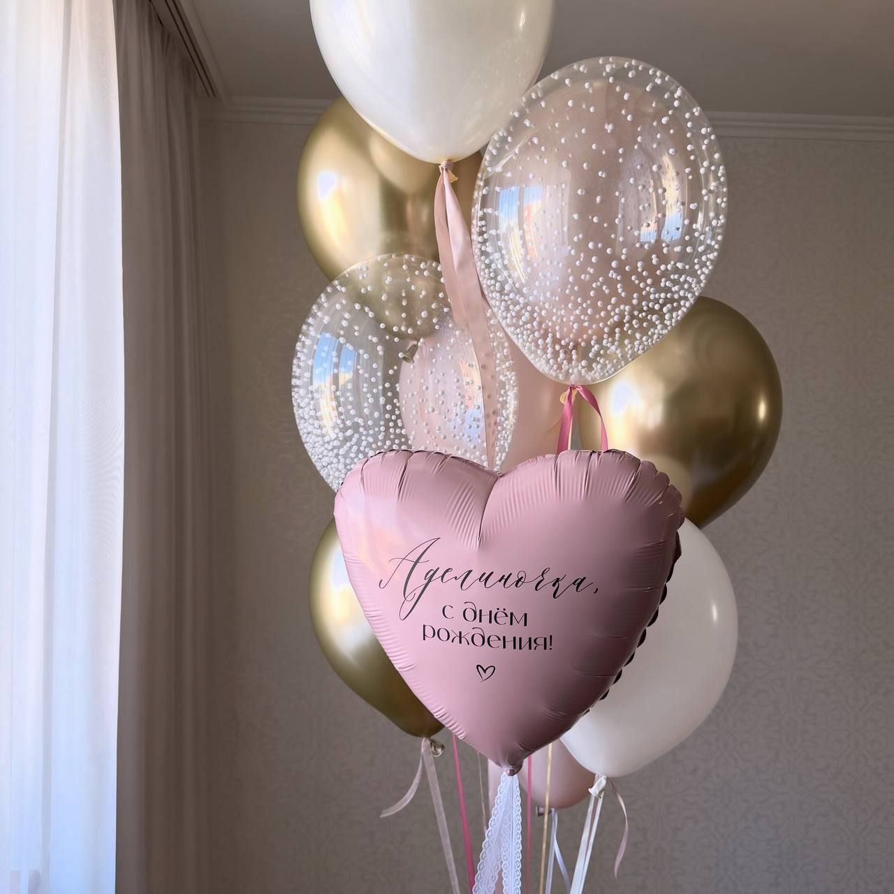Нежная композиция из шариков в форме сердца в розовых, золотых и прозрачных оттенках создает волшебную атмосферу дня рождения. Прозрачные шарики с белыми капельками как лепестки росы, наполняют комнату легкостью и радостью. Это фото передает трепетные эмоции и любовь, которая окутывает именинницу в этот особенный день.