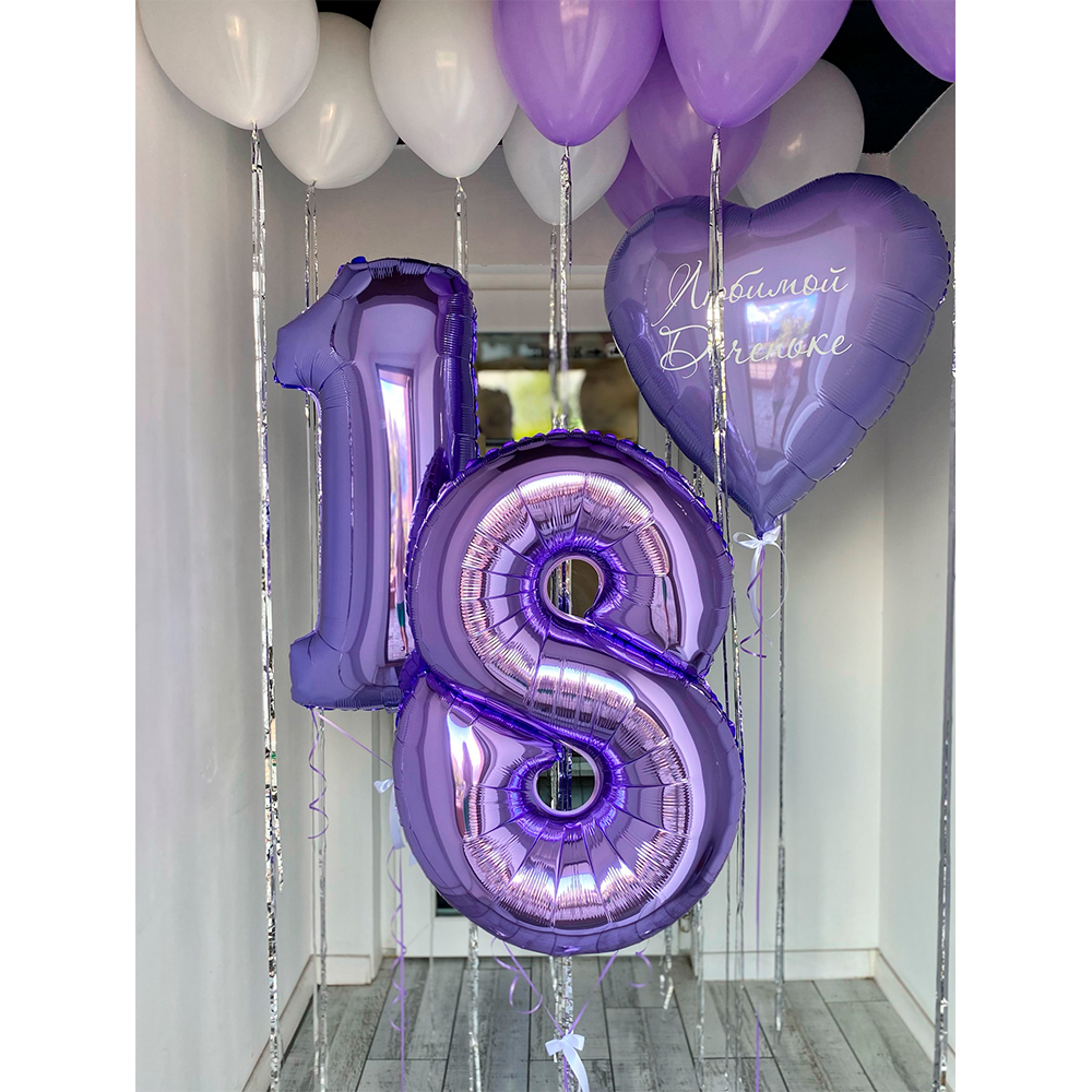 Эта стильная и впечатляющая композиция создана для празднования 18-летия — важного этапа в жизни. Яркие фиолетовые шары в виде цифр привлекают внимание и добавляют выражению «взрослости» особый акцент. Сердце с теплой надписью подчеркивает важность этого момента. Белые и фиолетовые шары придают праздничности и гармонии, создавая атмосферу радости и незабываемых эмоций. Идеальное решение для торжественного и стильного празднования.