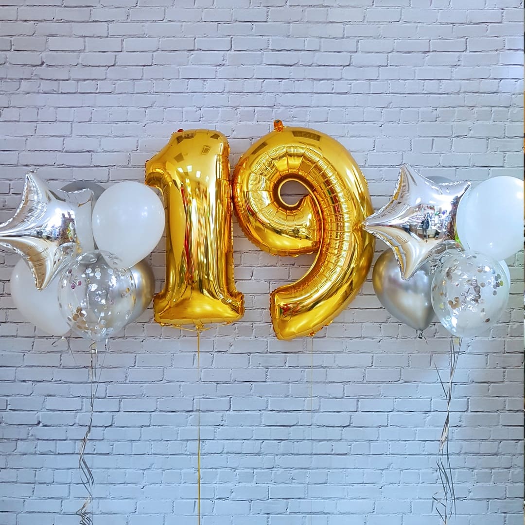 Отметьте особые мгновения с блестящей композицией воздушных шариков, воплощающих элегантность и радость. Золотые цифры выделяются на фоне серебряных и прозрачных шариков, создавая атмосферу роскоши и стиля. Это идеальный выбор для празднования дня рождения или юбилея, который запомнится надолго. Закажите эту композицию, чтобы добавить вашему празднику настоящего блеска!