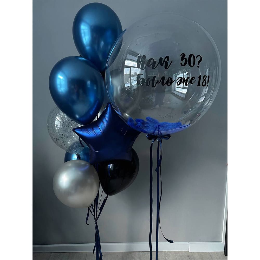 Превратите праздник в веселое и стильное событие с этой композицией в благородных синих и серебряных оттенках. Игривая надпись добавляет нотку юмора, делая день рождения незабываемым и ярким.