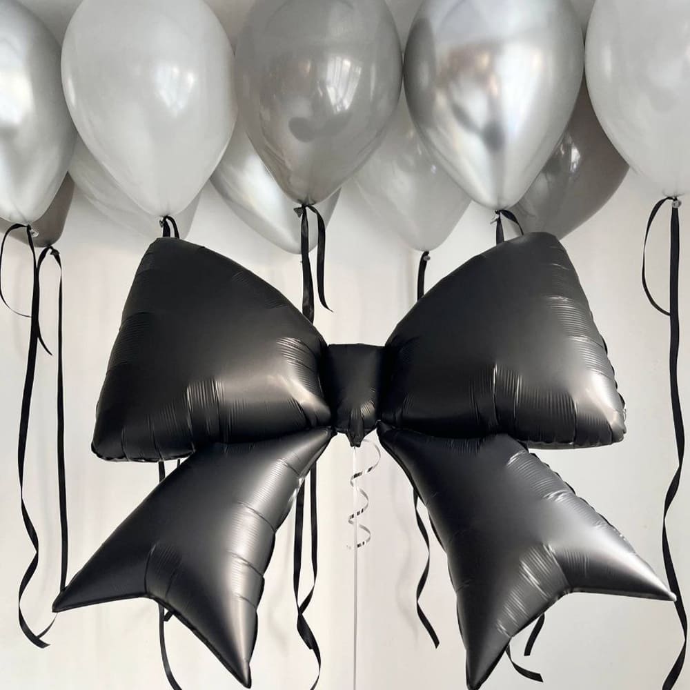 Очаруйте гостей изысканной композицией в классических черно-серебристых тонах. Центральный элемент — большой черный бант, придающий образу стиля и шарма. Идеальный выбор для празднования с нотками современного глянца и непревзойденной элегантности.