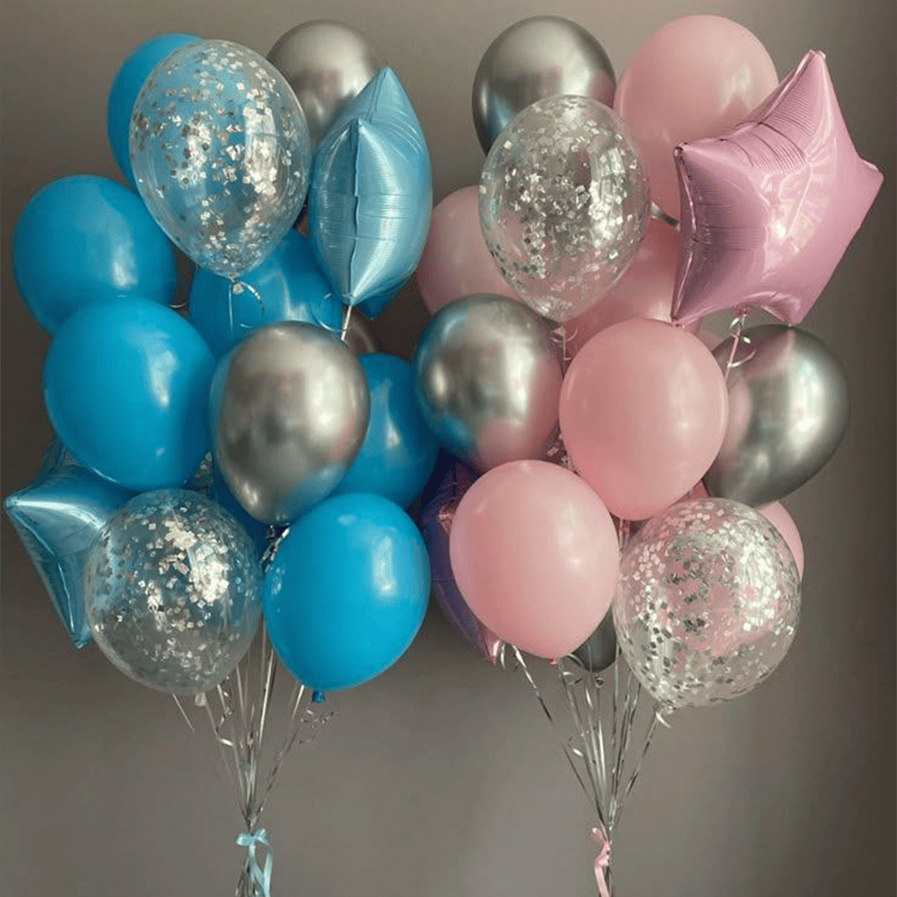 Изящная композиция из голубых, розовых и серебристых шариков создает атмосферу волшебного праздника. Звезды и блестки добавляют композиции сказочности, а нежные цвета излучают радость и надежду. Это мгновение, когда мечты становятся реальностью, наполняя пространство гармонией и счастьем.