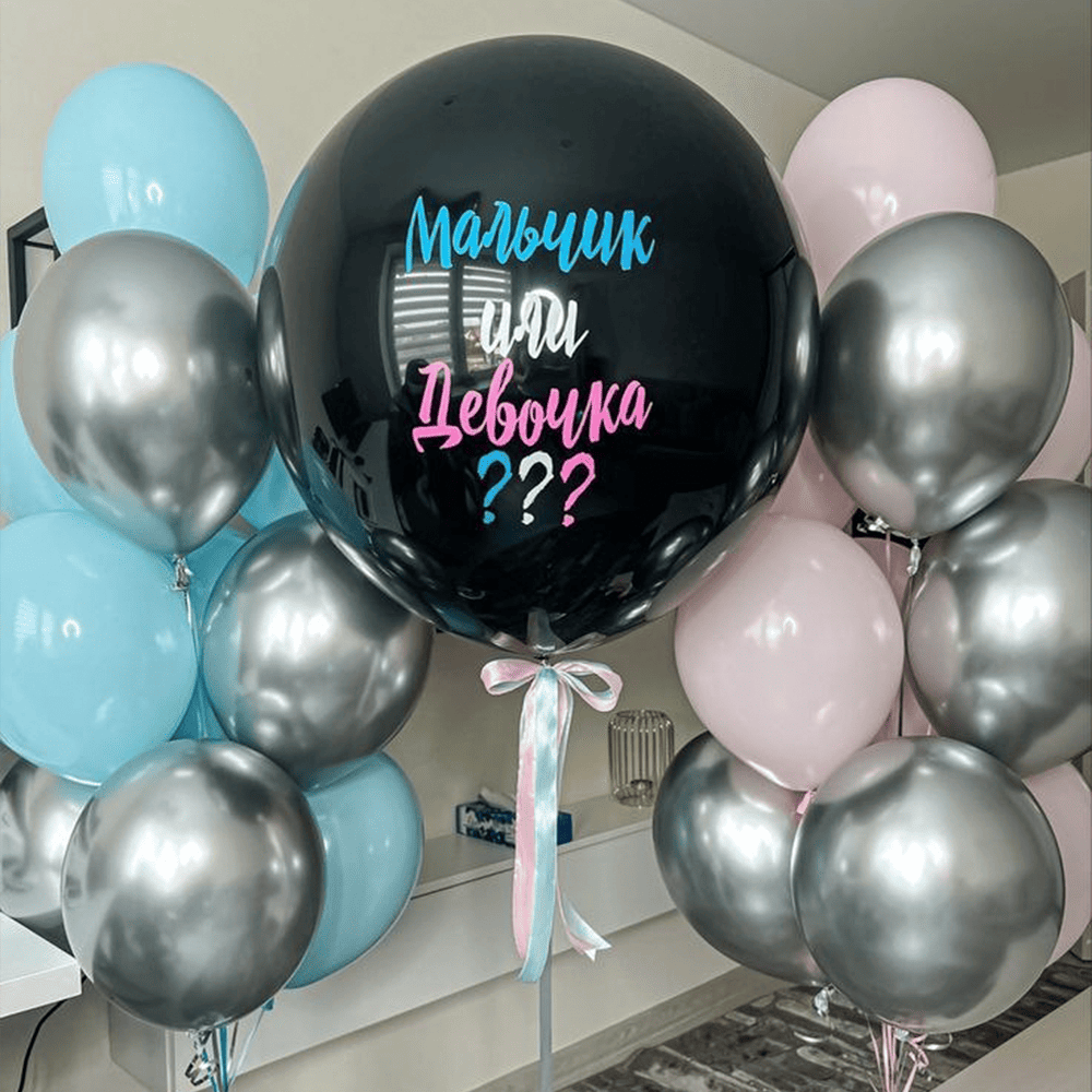В этой комнате царит атмосфера захватывающего предвкушения: синие и розовые шары на фоне зеркала как будто соревнуются между собой, держа в секрете свой ответ. Большой черный шар с надписью «Boy or Girl?» готов раскрыть маленькую загадку, которая станет началом новой семейной истории.