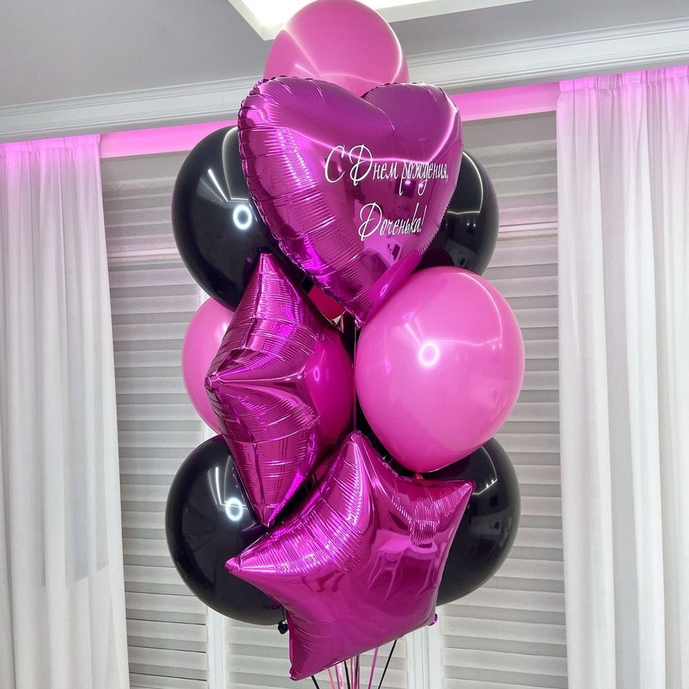 Эта яркая и стильная композиция из шариков полна энергии и любви, идеально подходит для дня рождения дочери. Розовые шарики в форме сердца и звезд добавляют романтичности, в то время как черные шары создают контраст и делают композицию современной и изысканной. Надпись на сердце подчеркивает особенность события, делая этот день незабываемым. Это великолепное сочетание цветов и форм обязательно вызовет восхищение и улыбки.